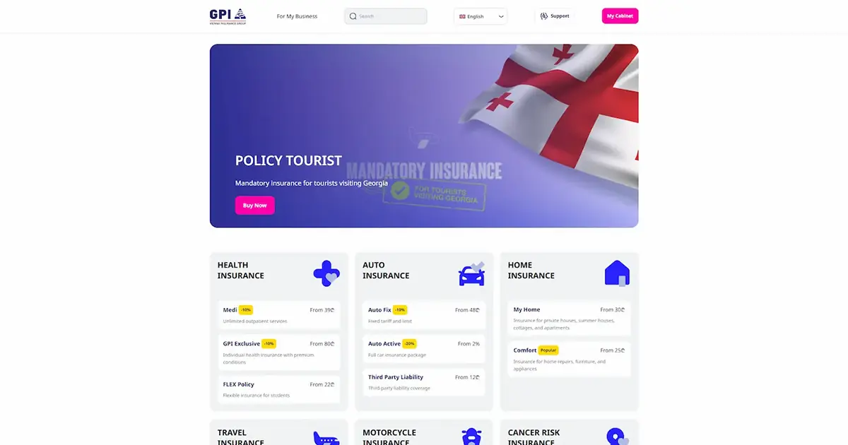 GPI Holding is a Georgian insurance company that required a full website build from scratch based on a Figma design. The site needed to be bilingual (Georgian and English), feature a flexible content structure, and be optimized for search engines. A critical requirement was preserving search rankings during the transition from the old site — no indexed page could