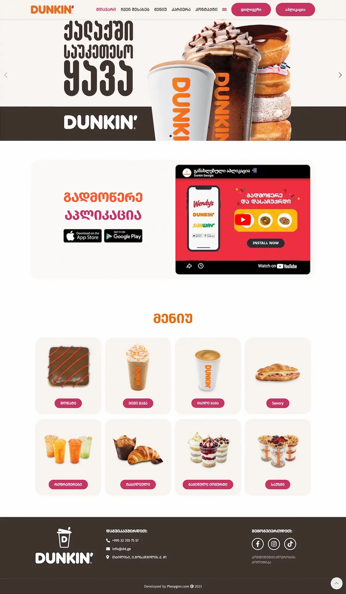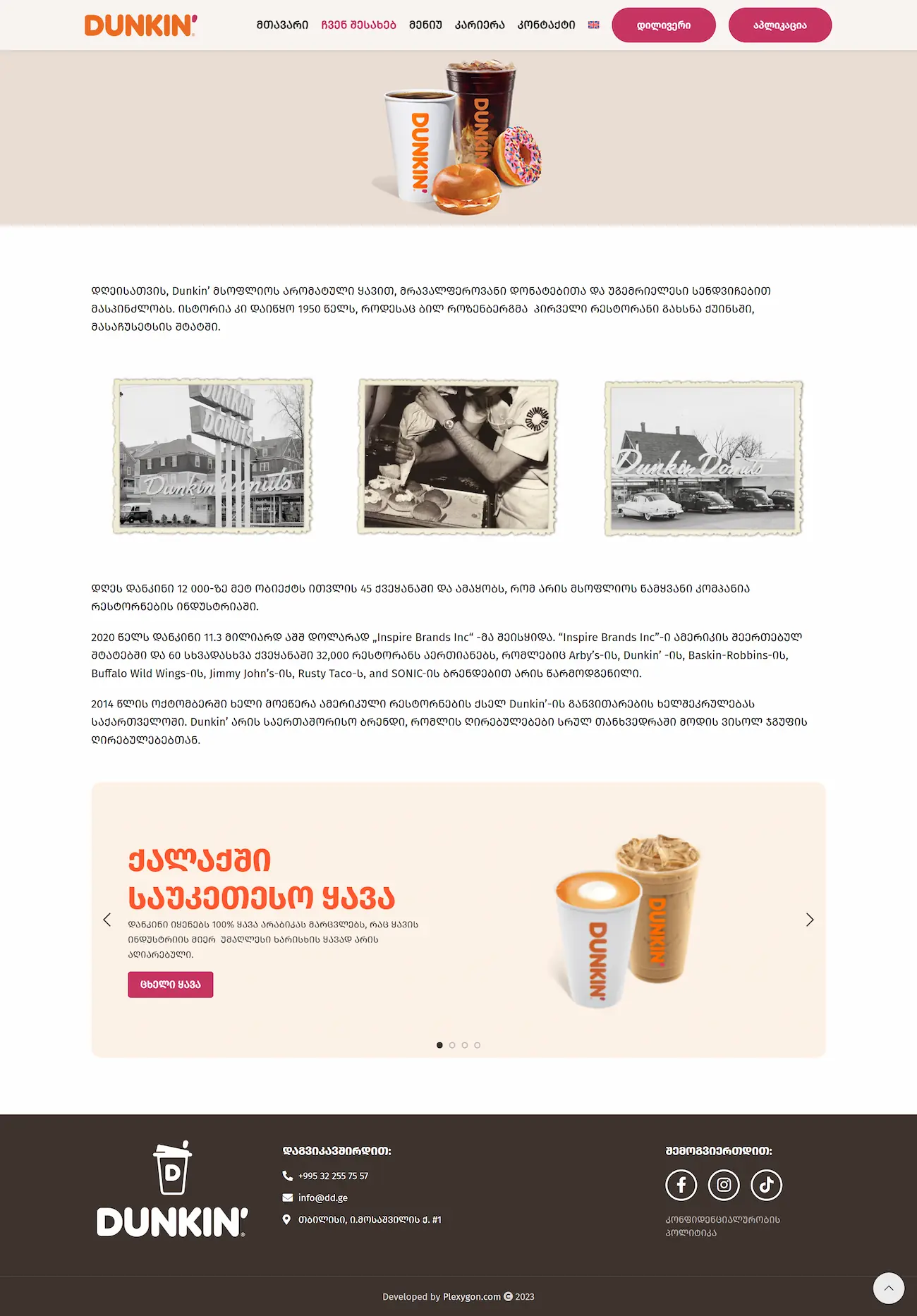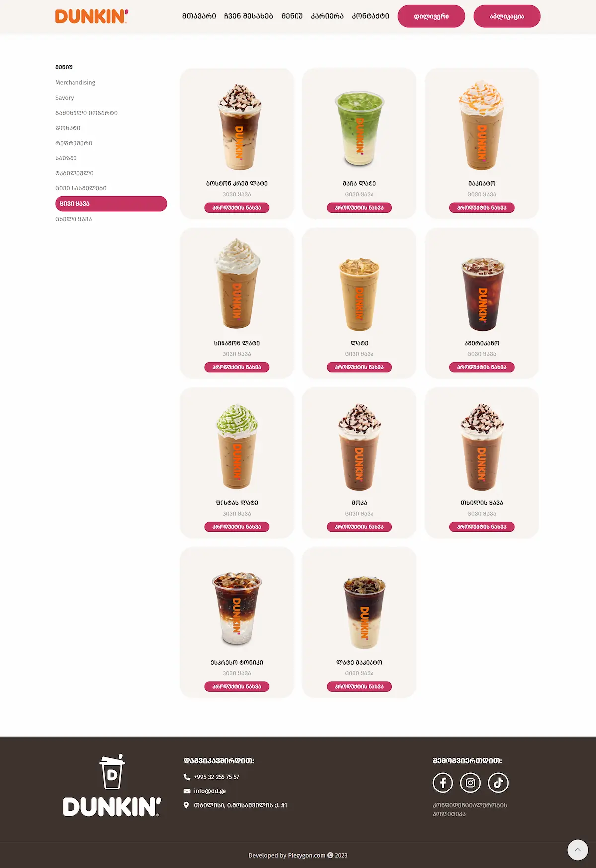 Outcome : A clean catalog website representing the Dunkin' brand in the Georgian market — featuring the full menu, company information, and a cohesive brand experience.