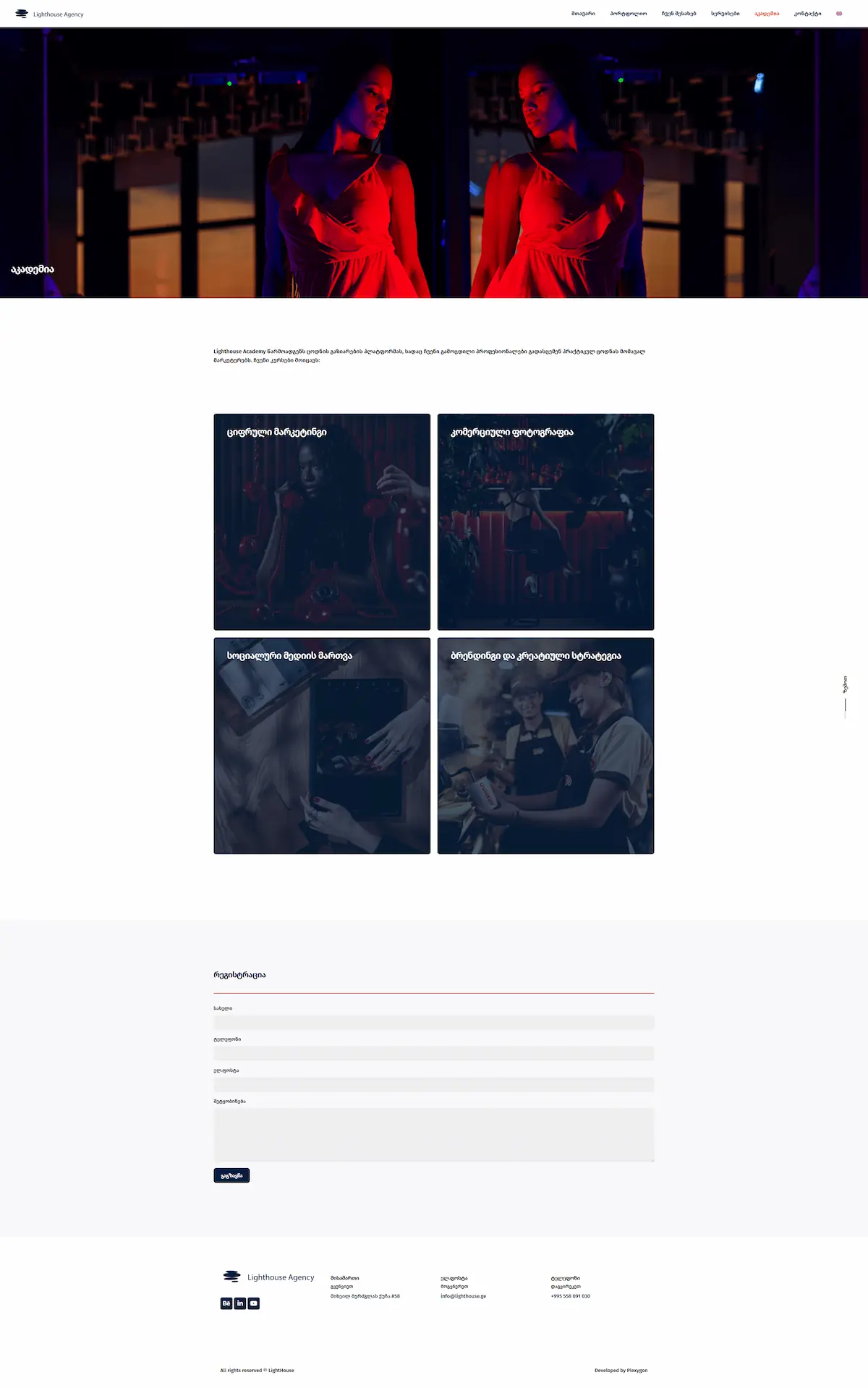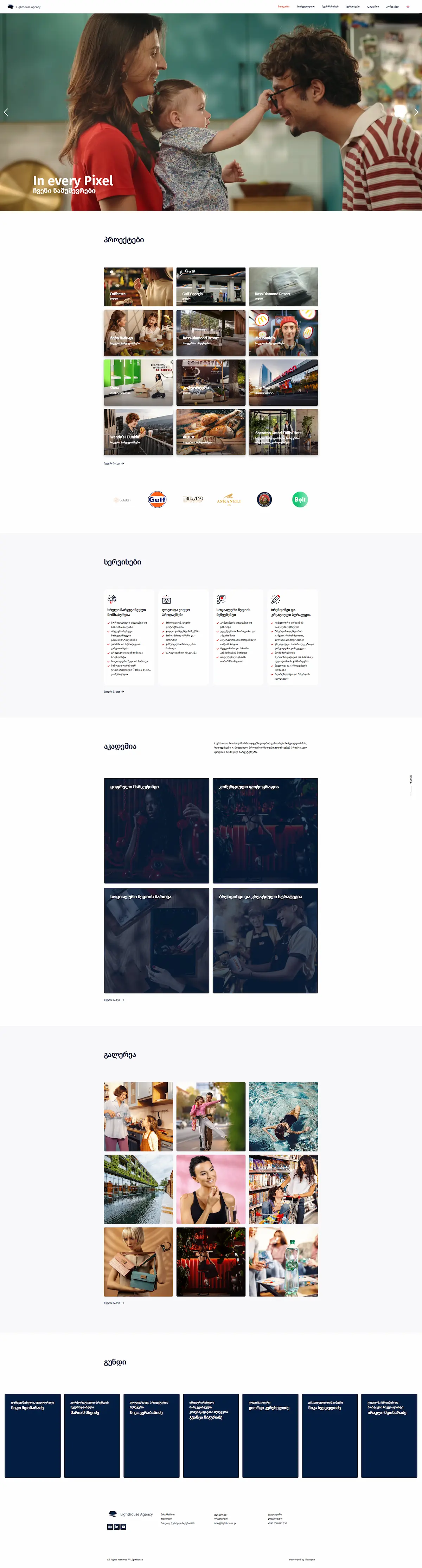Task : Lighthouse Agency is a full-service marketing agency in Georgia that combines creative thinking with data-driven solutions. Working with brands like SOCAR, Radisson RED, Sheraton, Wendy's, Bolt, Gulf, Tbilvino, Askaneli, and Paulaner, the agency needed a professional website to showcase its services, project portfolio, and academy.