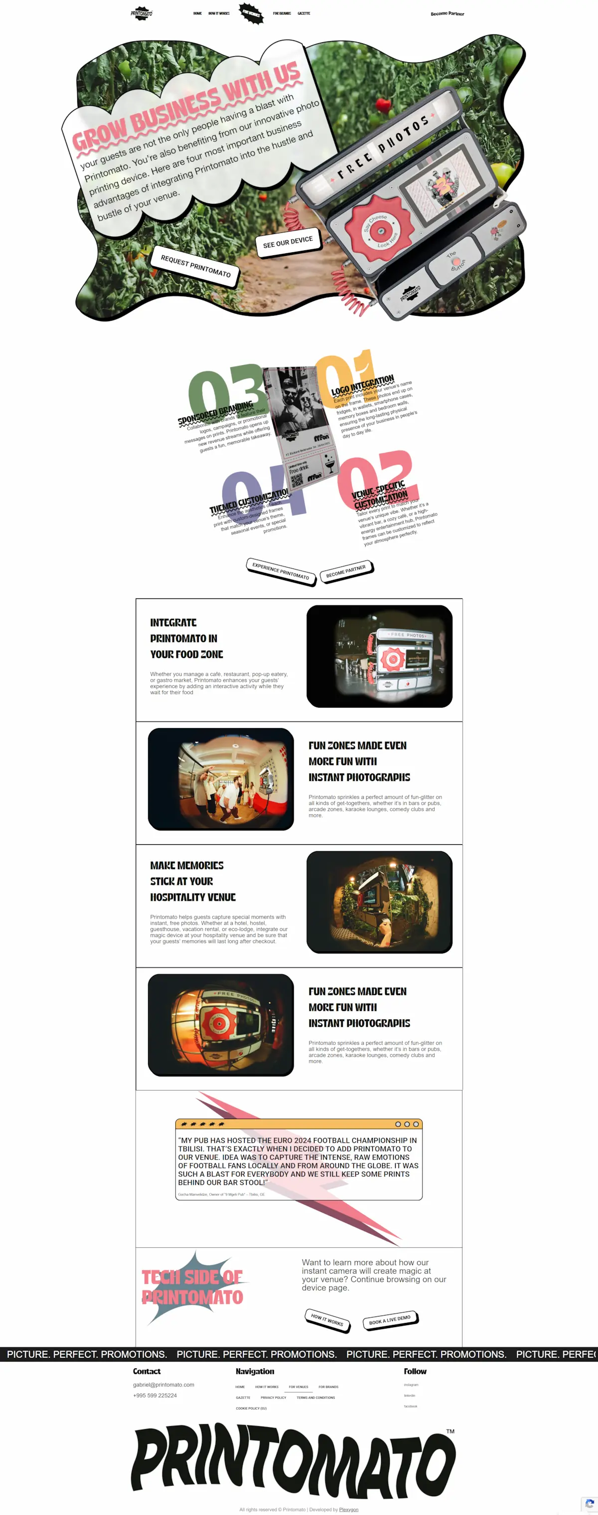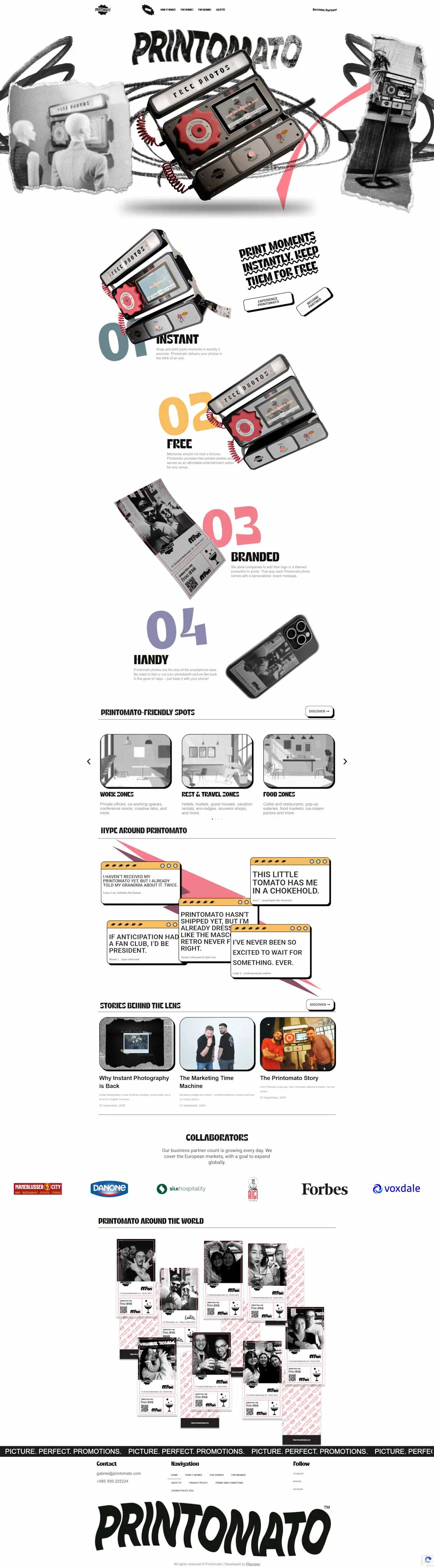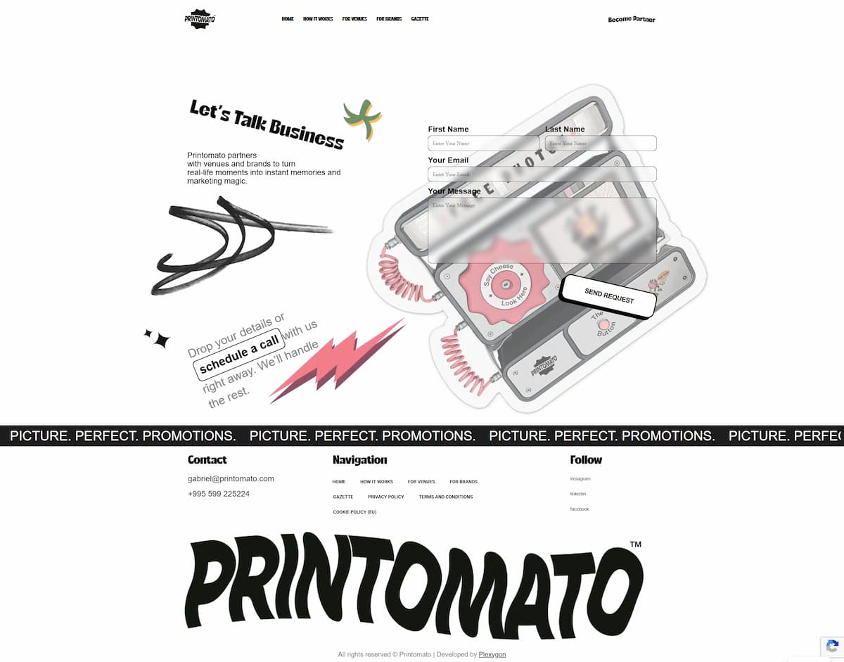 Task : Printomato is an innovative instant photo printing service that delivers free branded photos in seconds. Designed for venues — cafes, hotels, bars, coworking spaces — and brands looking for a creative offline marketing tool, the company operates across European markets with plans for global expansion. Printomato needed a polished, visually striking website that would convey the product's playful identity while clearly communicating its value to two distinct audiences: venue partners and advertising brands.