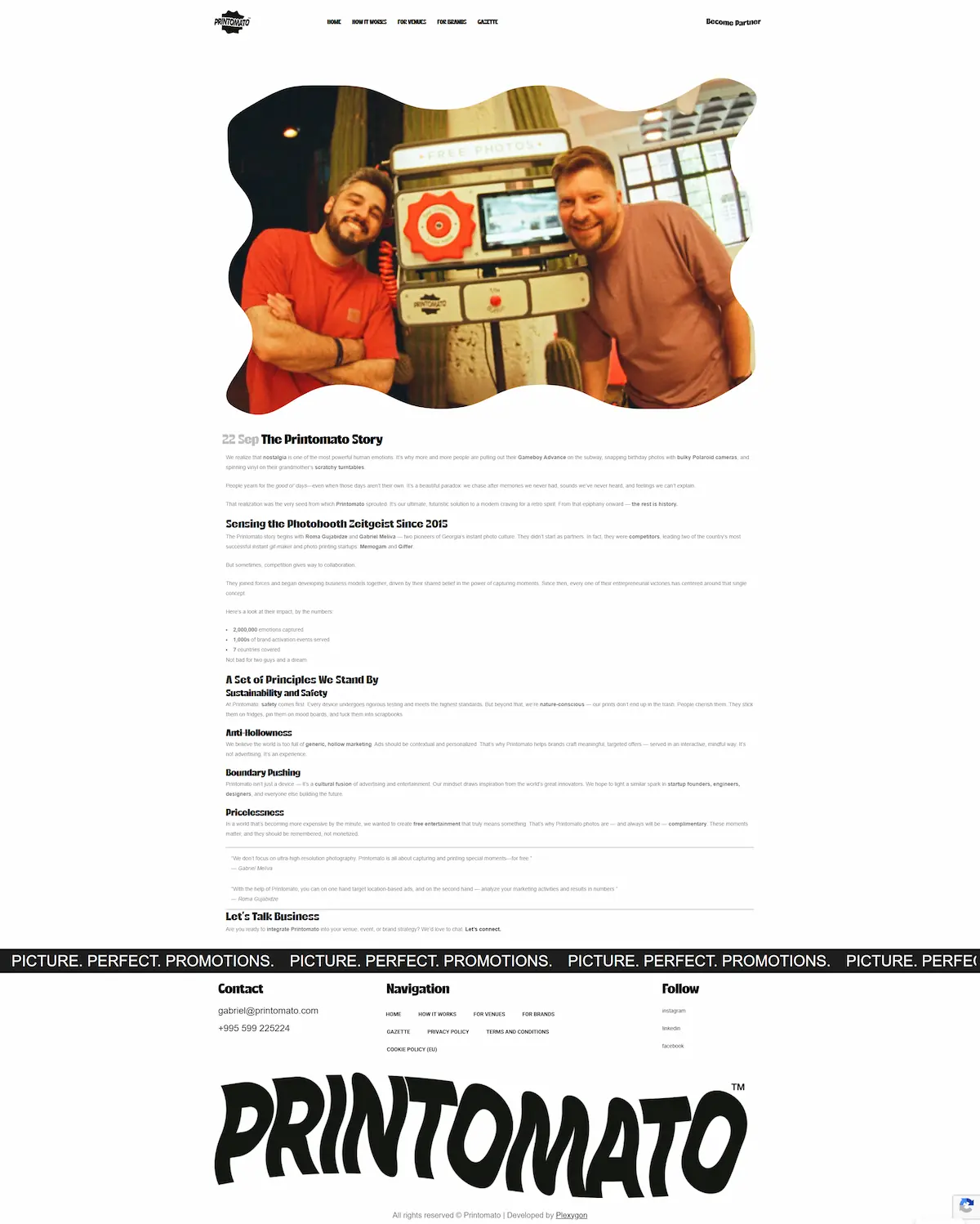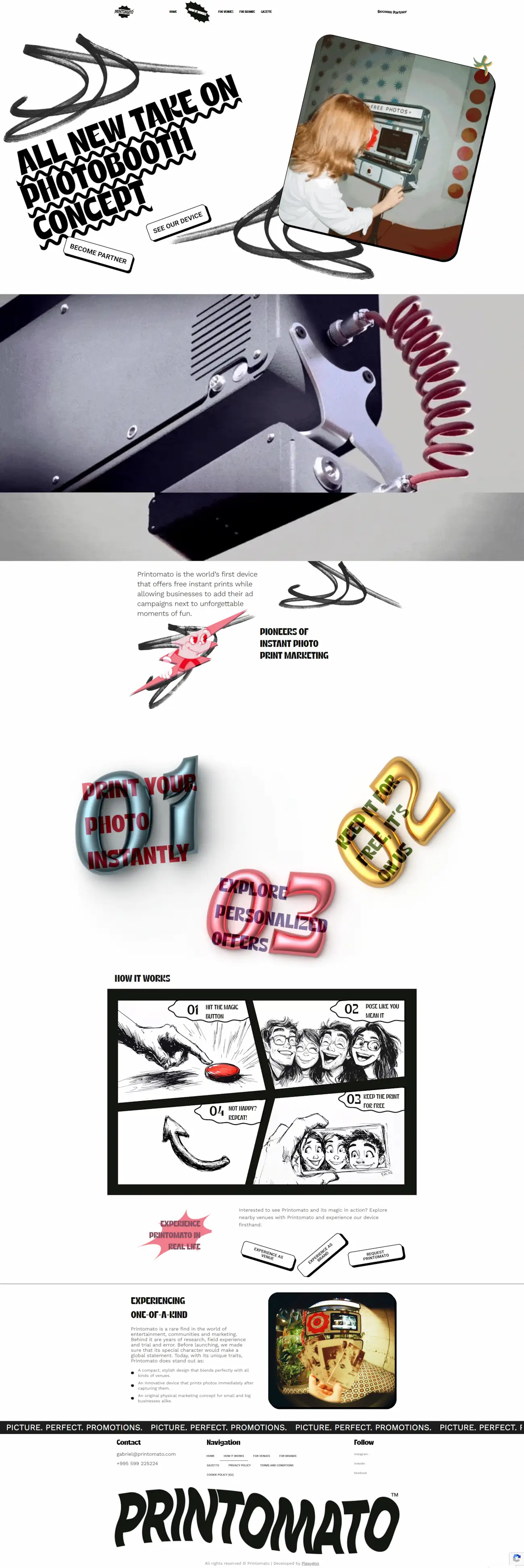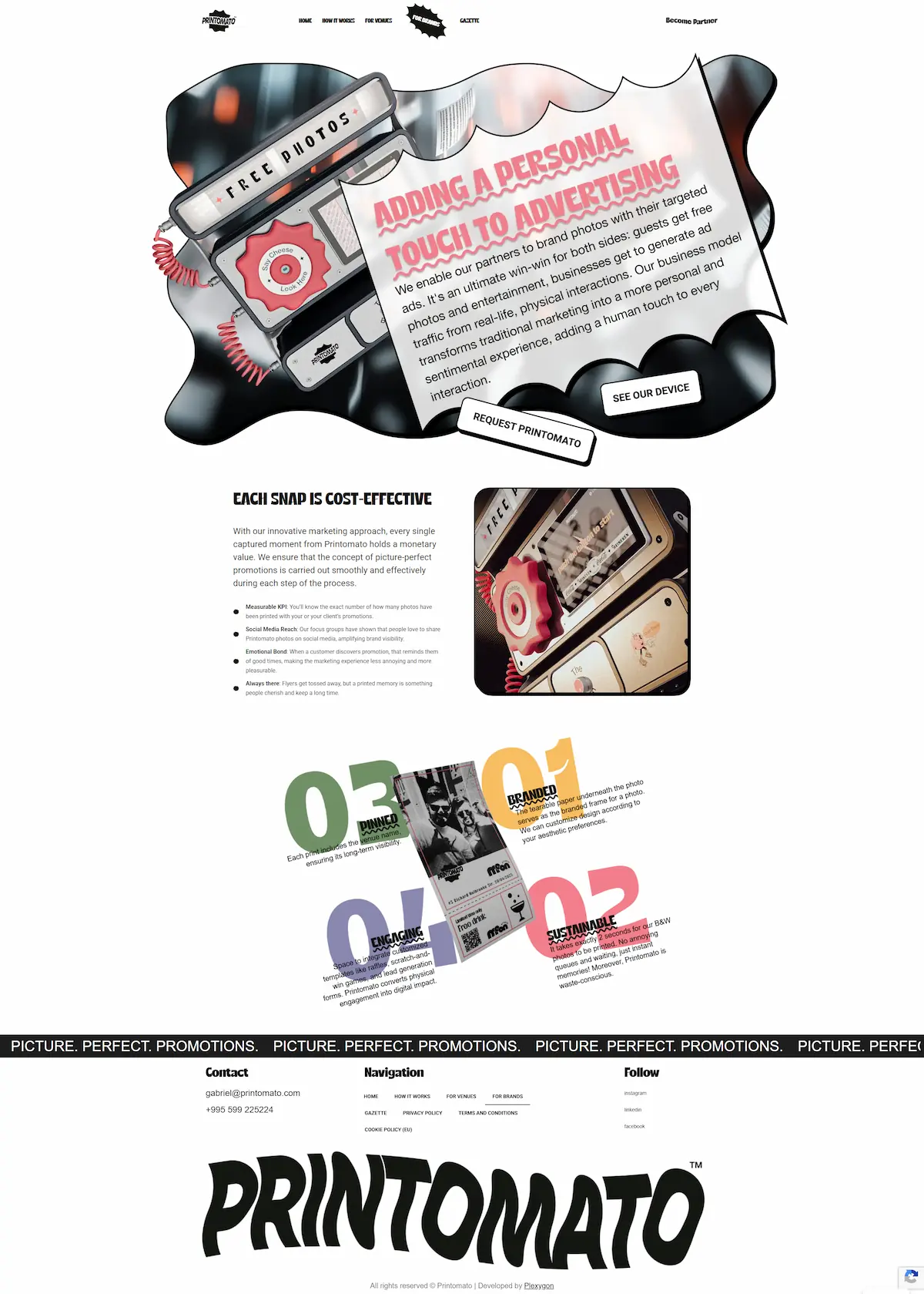 Task : Printomato is an innovative instant photo printing service that delivers free branded photos in seconds. Designed for venues — cafes, hotels, bars, coworking spaces — and brands looking for a creative offline marketing tool, the company operates across European markets with plans for global expansion. Printomato needed a polished, visually striking website that would convey the product's playful identity while clearly communicating its value to two distinct audiences: venue partners and advertising brands.