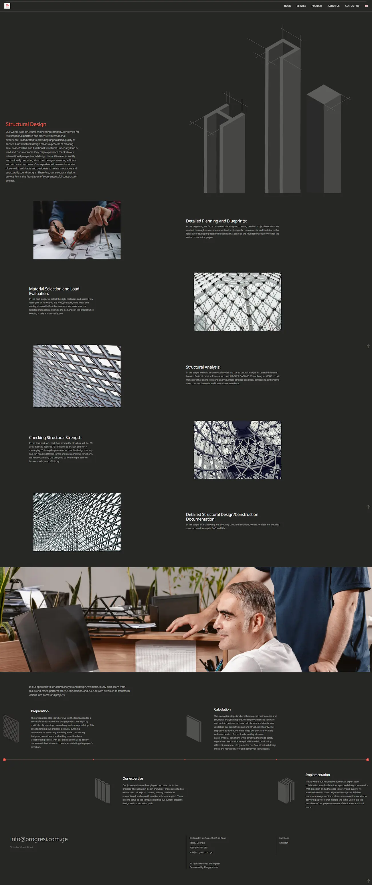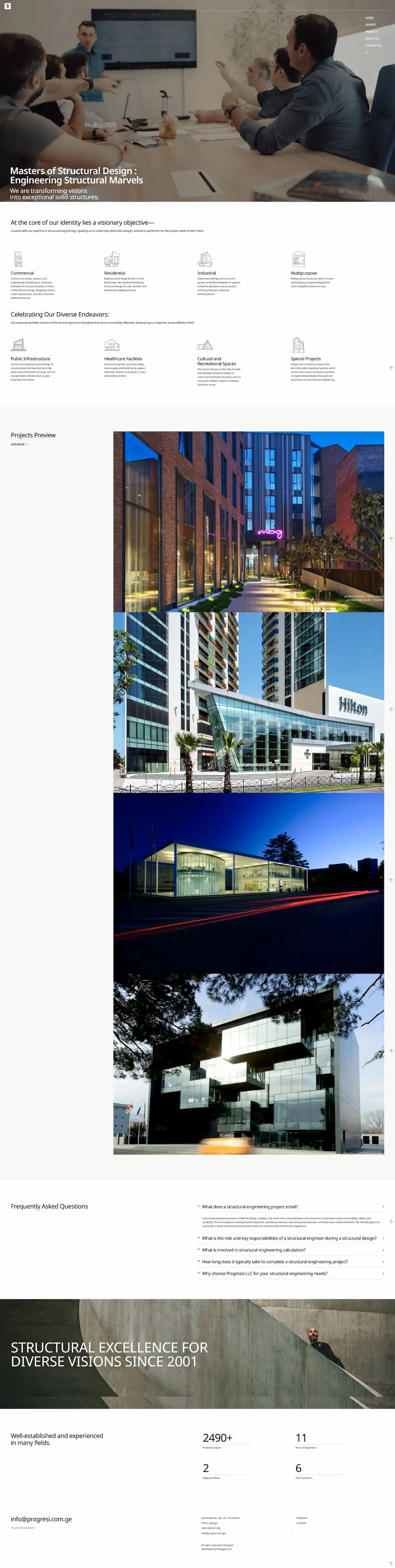 Task : Progresi is a structural engineering firm established in 2001 in Tbilisi, specializing in structural design, analysis, construction documentation, and site supervision across commercial, residential, industrial, and public infrastructure sectors. With notable projects including the Hilton Black Sea Hotel and the Ukrainian Embassy in Georgia, the company needed a professional website to showcase its expertise and project portfolio.