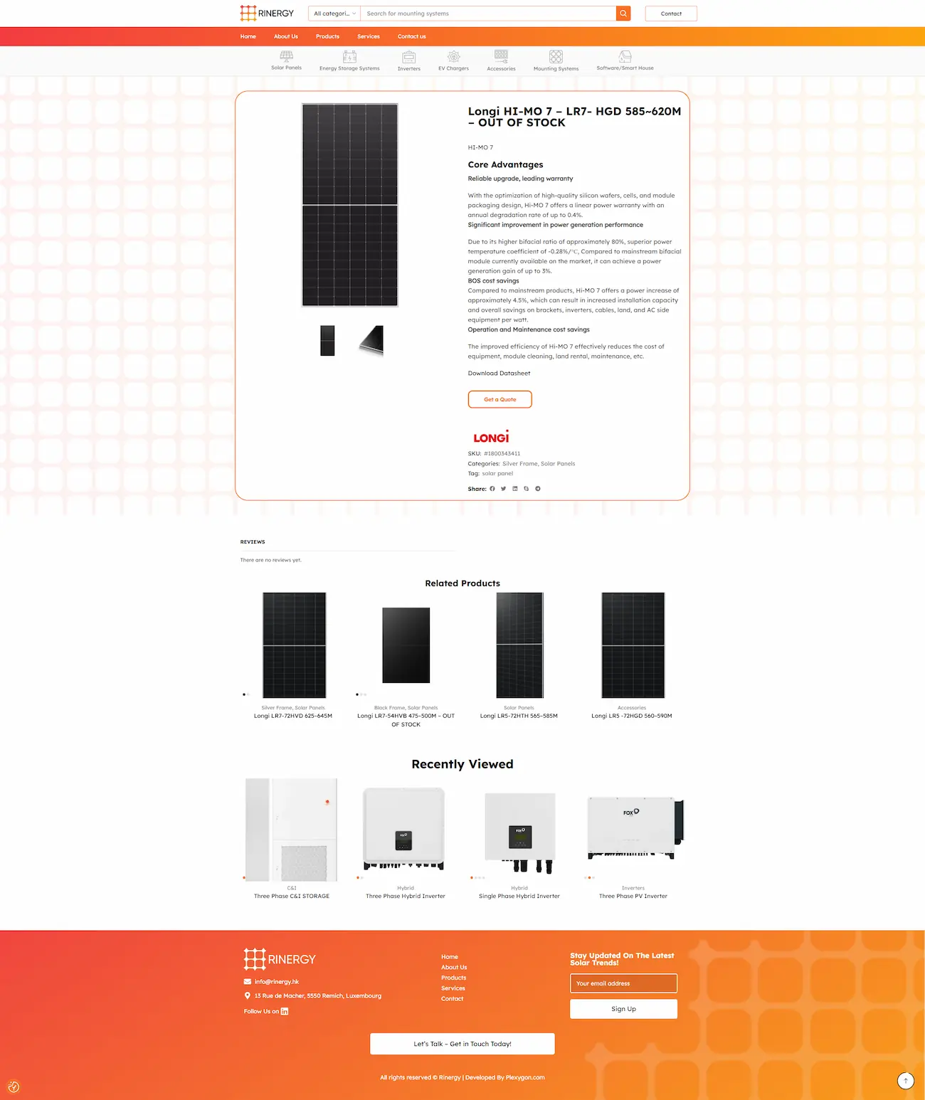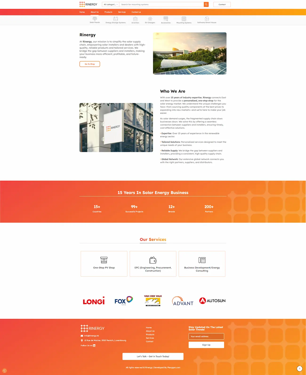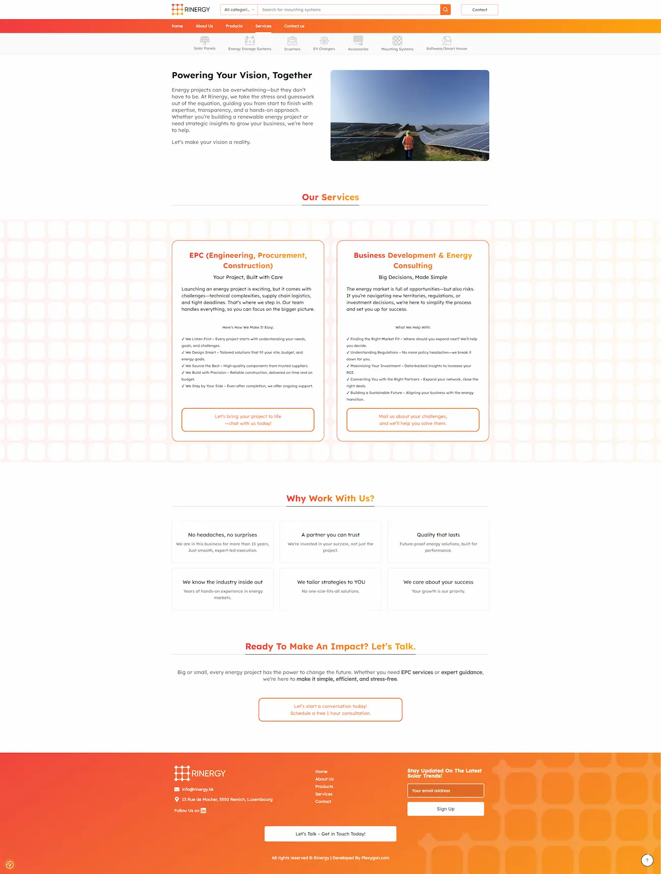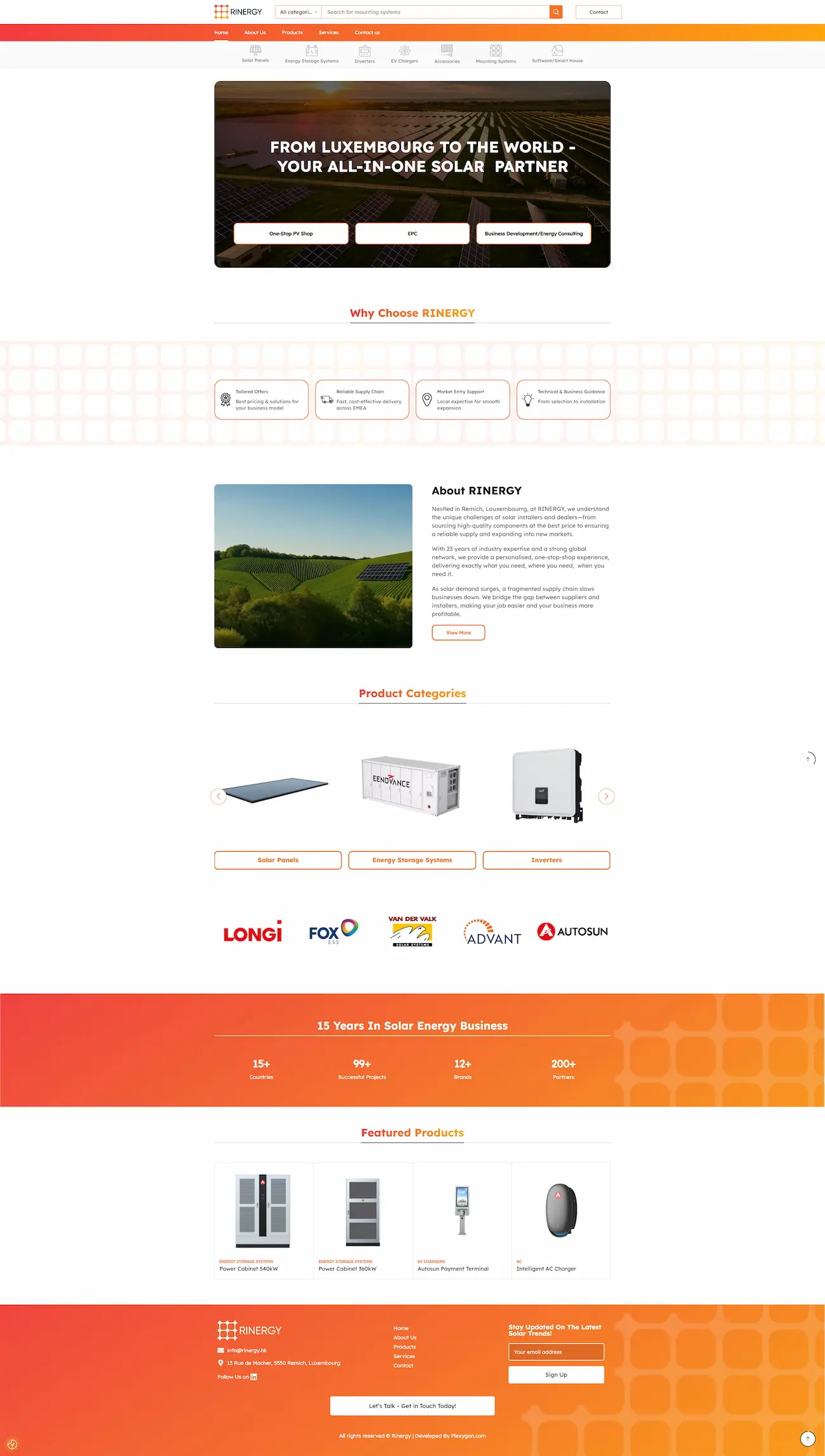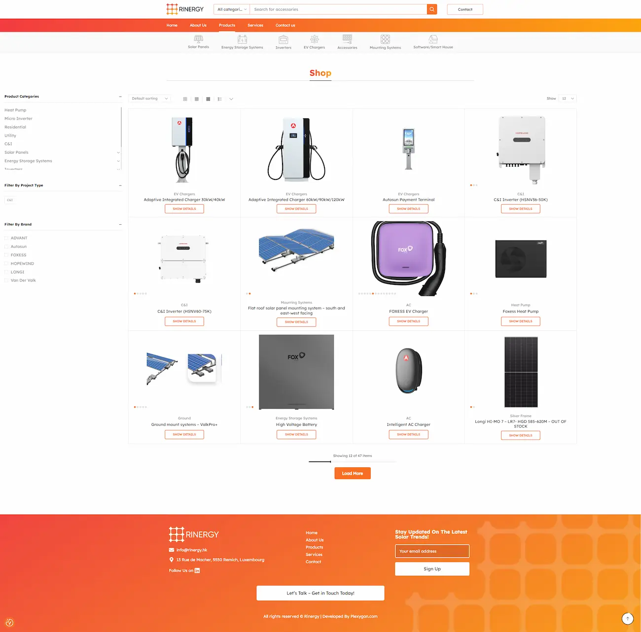 Task : Rinergy is a Luxembourg-based B2B company with 15 years of experience in the solar energy industry, serving as a one-stop supplier for installers and dealers across the EMEA region. Their catalog includes solar panels, inverters, energy storage systems, EV chargers, mounting systems, and smart home software. The company needed a product catalog website with the ability to scale into a full online store.